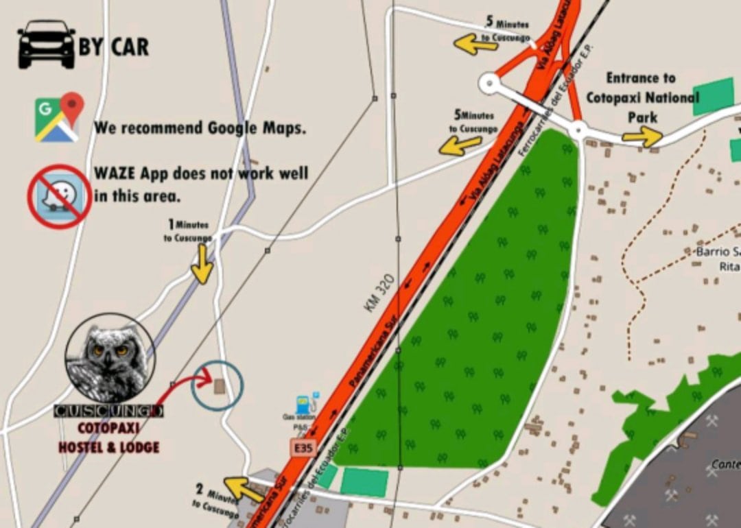 Si vienes en auto propio o rentado te recomendamos usar la aplicación Maps me. En bus puedes tomar uno con dirección hacia Latacunga pero debes solicitar al conducto del bus que te deje 1km después del ingreso al Parque Nacional Cotopaxi, desde ahí es fácil acceder caminando.